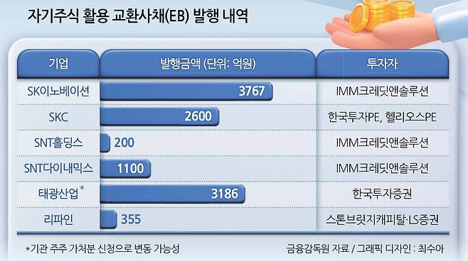 4일 투자은행(IB) 업계에 따르면 올해 자사주 기반으로 발행이 완료됐거나 예고된 EB 규모는 1조1208억원이다. 해당 기업은 ▷SK이노베이션 ▷SKC ▷SNT홀딩스 ▷SNT다이내믹스 ▷태광산업 ▷리파인 등이다. 태광산업의 경우 한국투자증권 도움을 받아 보유 자사주 전량을 EB로 처분할 계획을 세우고 있다. 다만 기관 주주인 트러스톤자산운용이 관련 절차에 제동을 걸었다. 주주에 미칠 영향을 고려해 반대하면서 법원에 가처분 신청한 상태다.