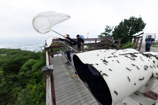 [서울=뉴시스] 4일 환경부 및 소속기관 직원들이 인천 계양구 계양산에서 러브버그(붉은등우단털파리) 성체를 제거하기 위해 송풍기와 포충망을 활용하여 방제 작업을 하고 있다. (사진=환경부 제공) 2025.07.04. photo@newsis.com *재판매 및 DB 금지