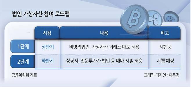지난해부터 금융당국은 법인의 가상자산 거래를 허용하는 방안에 대해 논의해왔다. 올해 초 당국은 ‘법인의 가상자산시장 참여 로드맵’을 발표해 법인의 가상자산 거래를 단계적으로 허용하겠다고 밝혔다. 지난 6월부터는 비영리기관과 가상자산거래소의 매도 거래가 허용됐고, 하반기 중에 상장회사와 전문투자자 등록법인 등의 매매를 시범적으로 허용할 예정이다.