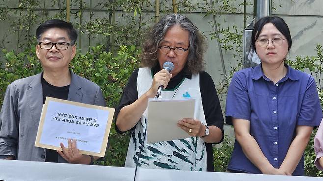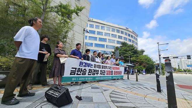 | ▲ 보철거시민행동은 2일 세종시 환경부 청사 앞에서 열린 기자회견에서 금한승 환경부 차관 임명 철회를 촉구했다 |