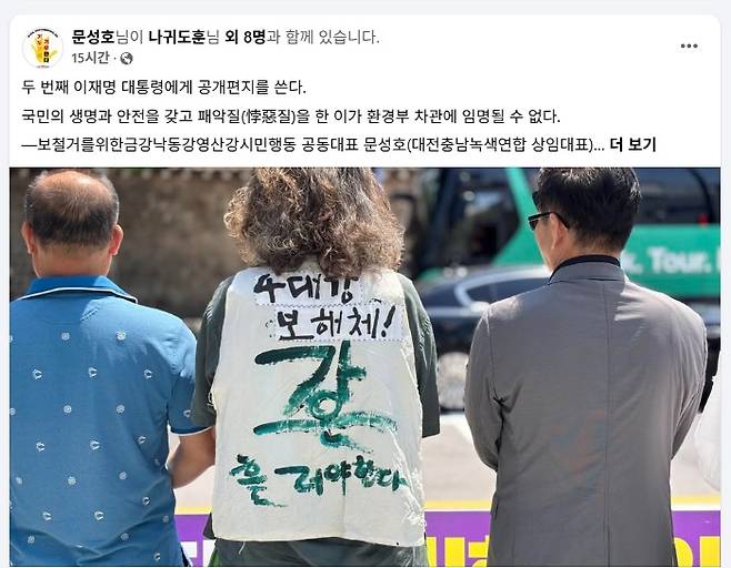 문성호 보철거를위한금강낙동강영산강시민행동 공동대표(대전충남녹색연합 상임대표)가 3일 자신의 SNS인 페이스북에 올린 글의 일부이다. 문 대표는 전날인 2일 세종시 환경부 청사 앞에서 열린 기자회견에서도 윤석열 정부에서 국립환경과학원장을 지낸 금 차관이 환경단체들의 낙동강 녹조 조사 결과 등을 묵살한 행적 등을 조목조목 비판한 바 있다.