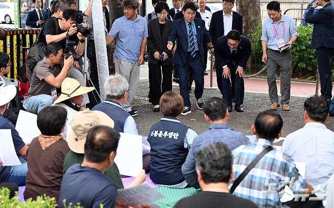 김민석 국무총리가 4일 서울 용산 대통령실 앞에서 항의 집회 중인 농민단체와 면담하고 있다. 이들 단체는 '농업4법'을 '농망4법'이라고 했던 송미령 농림축산식품부 장관의 유임을 반대하며 송 장관이 물러날 때까지 투쟁을 멈추지 않겠다고 예고한 상태다.