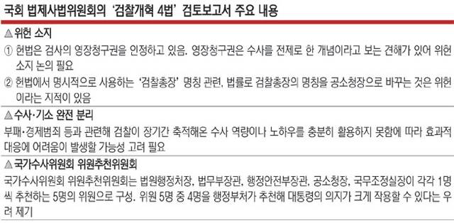 국회 법제사법위원회 검토보고서에서 '검찰개혁 4법'(검찰청법 폐지법·공소청 설치법·국가수사위원회 설치법·중대범죄수사청 설치법) 일부 조항에 대한 위헌 가능성을 제시하며 보다 신중한 논의가 필요하다는 제언이 4일 나온다.
