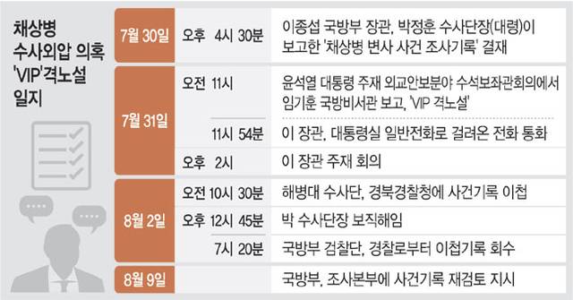 채상병특검은 오는 7일 오전 10시 30분 수사외압 사건의 ‘키맨’으로 불리는 김계환 전 해병대 사령관을 소환 조사하는 한편, ‘VIP 격노설’의 진상 규명에 착수할 방침이다. 채상병특검 관계자는 이날 “외교안보수석보좌관회의에 핵심으로 참석했던 사람뿐 아니라 정황을 아는 사람들도 있을 것”이라며 “그 사람들을 다음 주부터 모두 불러 조사할 계획”이라고 밝혔다. VIP 격노설은 윤 전 대통령이 2023년 7월 31일 외교안보수석보좌관회의에서 채 상병 순직사건에 대한 박정훈 당시 해병대 수사단장의 초동수사 결과와 함께 경찰 이첩 내용을 보고받은 뒤 “이런 일로 사단장을 처벌하면 누가 사단장을 하겠느냐”며 크게 화를 냈으며, 이후 조사 결과가 뒤집혔다는 의혹이다. 조태용 당시 국가안보실장과 임기훈 당시 국가안보실 국방비서관 등이 해당 회의에 참석한 것으로 알려졌다.