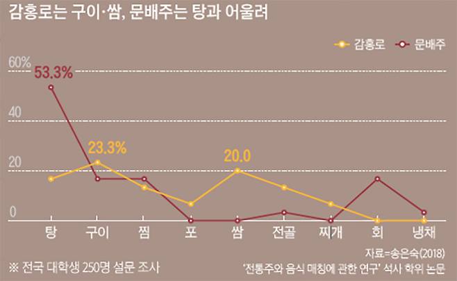 설문 결과, 전통주에 어울리는 음식이 다양하게 나타났다. 황진이주는 생선 간장조림과 맥적을 고른 응답자가 각각 23.3%, 20%로 나타났다. 응답자는 ‘무게감이 강하지 않아 어류와 어울릴 것 같다’ ‘보디감이 강하지 않기 때문에 찜이나 전, 조림과 어울릴 듯’이라고 답했다. 복분자음은 고추장 양념의 장어구이, 복분자 막걸리는 가자미식해, 감홍로는 등심구이, 문배주는 조개맑은탕과 곱창구이, 솔송주는 나물 무침과 생선회가 어울린다는 응답이 많았다. 술의 맛과 향, 무게감에 따라 어울리는 식재료와 양념, 조리법을 저마다 추천한 결과다.