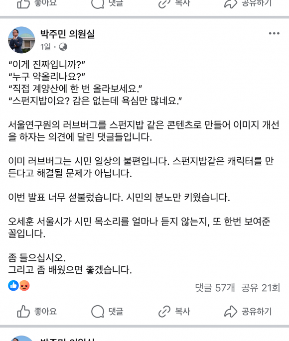 내용인즉슨 ‘서울연구원이 러브버그를 스펀지밥 같은 콘텐츠로 만들어서 이미지 개선을 하자는 제안에 대해 시민들이 분노하는 댓글을 달았다. 이것은 오세훈 서울시가 시민 목소리를 듣지 않는 것을 보여준 사례이다.’라는 것이다.