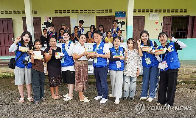 (서울=연합뉴스) 박천오 한국청소년진흥협회 대표가 4일(현지시간) 라오스 방비엥 폰숙초등학교에서 봉사 물품 분필을 폰숙초등학교 교장에게 전달, 기념 촬영하고 있다. 2025.7.4 [한국청소년진흥협회 제공. 재판매 및 DB 금지]