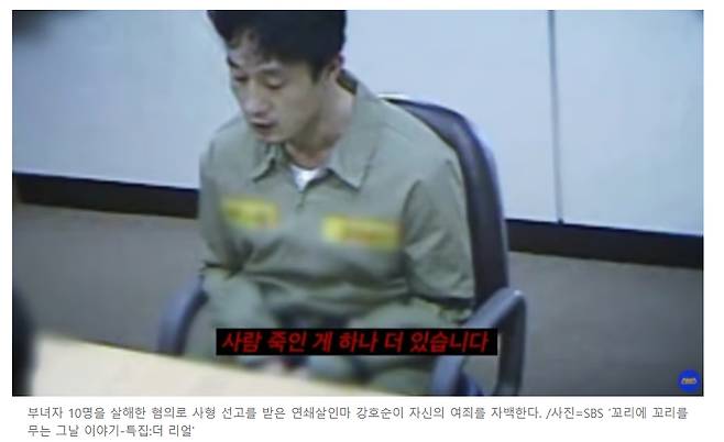연쇄살인범 강호순이 감춰뒀던 범행을 자백하는 영상이 공개돼 충격을 주고 있다.