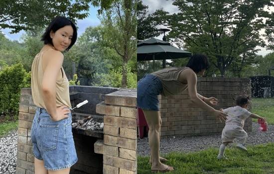 그런가 하면, 이어진 사진 속 윤진서는 달리는 딸을 향해 다가가는 모습이다. 비누방울 장난감을 들고 잔디밭을 신나게 달려가는 뒷모습만으로 보는 이들을 미소 짓게 만든다.
