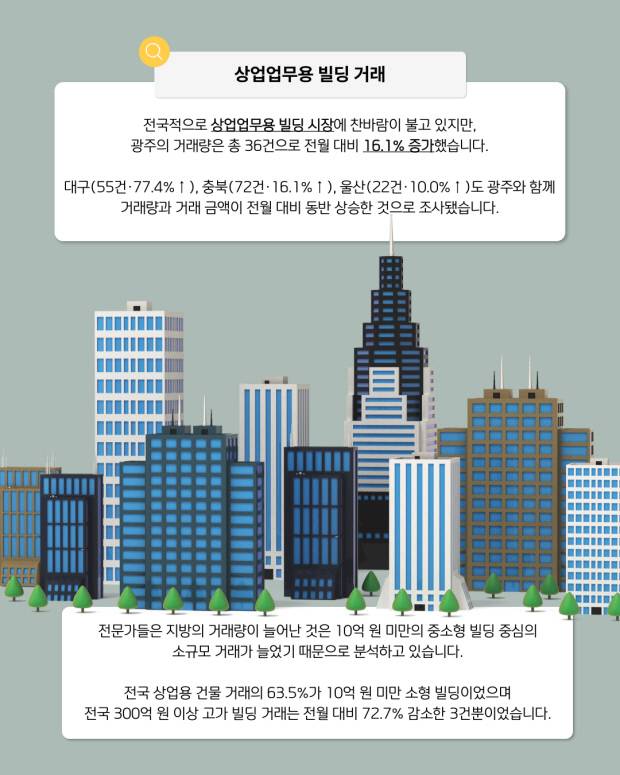 전국적으로 상업업무용 빌딩 시장에 찬바람이 불고 있지만, 광주의 거래량은 총 36건으로 전월 대비 16.1%로 유일하게 증가세를 보였습니다.