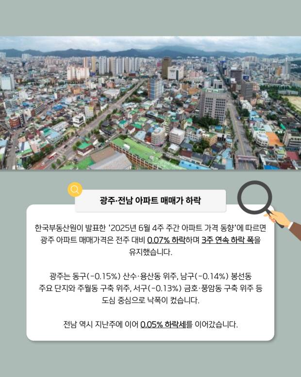 한국부동산원이 발표한 ‘2025년 6월 4주 주간 아파트 가격 동향’에 따르면 광주 아파트 매매가격은 전주 대비 0.07% 하락하며 3주 연속 하락 폭을 유지했고 전남 역시 지난주에 이어 0.05% 하락세를 이어갔습니다.