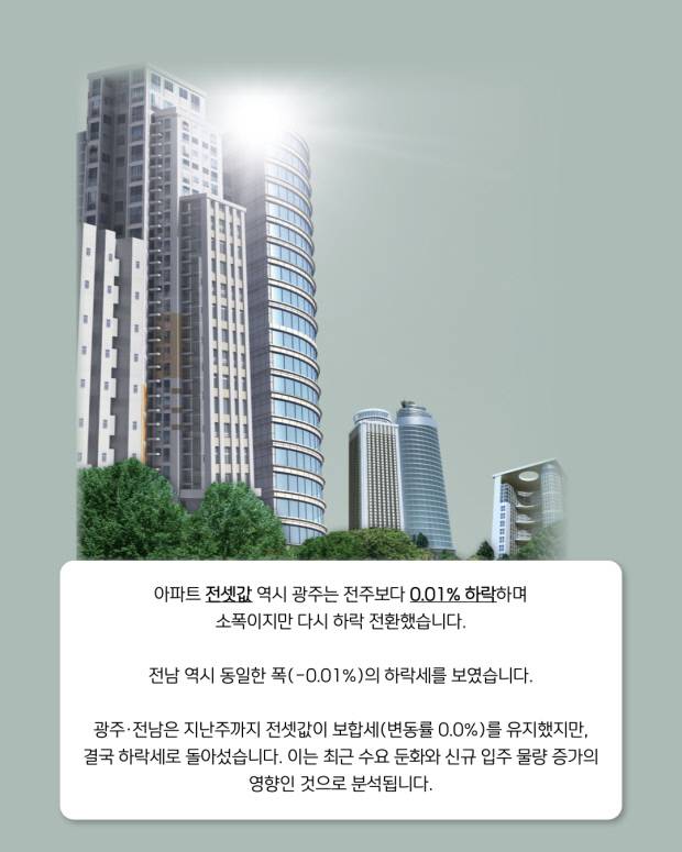 아파트 전셋값 역시 광주는 전주보다 0.01% 하락하며 소폭이지만 다시 하락 전환했습니다. 전남 역시 동일한 폭(-0.01%)의 하락세를 보였습니다.