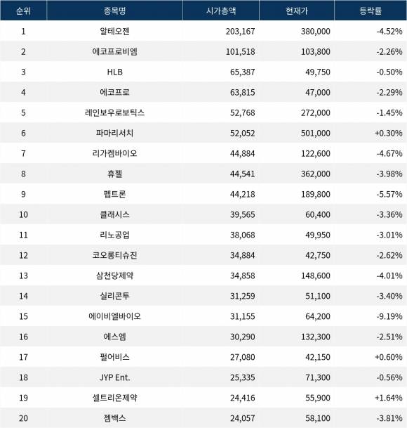 4일 한국거래소에 따르면, 시가총액 1위 알테오젠(액면가 500원)은 현재가 380,000원으로 전 거래일 대비 4.52% 하락하며 하락세를 보이고 있다. 상장주식수 53,465주에 외국인비율이 14.76%인 이 종목은 PER 162.60, ROE 29.52로, 재무 지표에서 고평가된 모습을 보인다. 바이오 대장주인 에코프로비엠(247540)(액면가 500원)은 103,800원으로 2.26% 하락하며, 거래량 232,084주를 기록하고 있다.