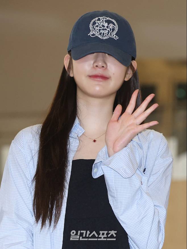 아이브 장원영이 4일 오후 해외 일정 참석을 위해 김포국제공항을 통해 일본 도쿄로 출국 전 포즈를 취하고 있다.