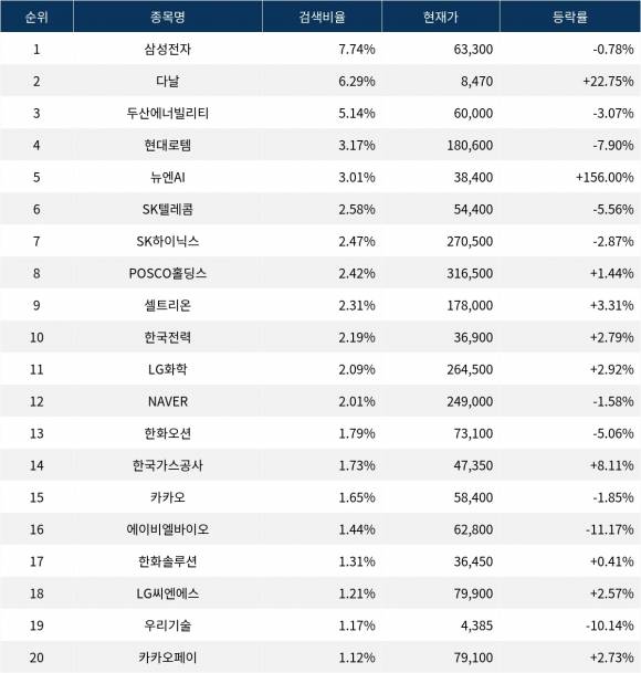 이어 검색비율 2위의 다날(064260)은 상승률 22.75%로 크게 상승 마감했다. 검색비율 3위의 두산에너빌리티(034020)는 3.07% 하락 마감했다. 검색비율 4위 현대로템(064350)은 하락률 7.90%로 하락했다. 검색비율 5위 뉴엔AI(463020)는 156.00% 상승하며 폭등 마감했다.