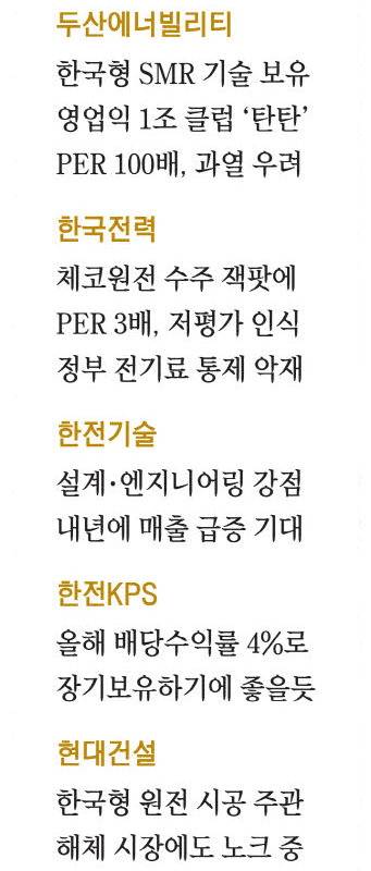 10년 전만 해도 증권가에선 '한전 삼총사' 이름이 자주 오르내렸다. 한전과 한전기술, 한전KPS를 말한다. 한전기술은 올 상반기에만 주가가 거의 두 배 올랐다. 이 상장사는 원전 설계와 엔지니어링을 맡는다. 이번에 한전이 따낸 체코 원전(두코바니 5·6호기) 설계용역사업 매출 반영이 내년부터 이뤄질 전망이다. 작년 대비 올해 매출증가율은 -2.3%지만 그다음해 증가율은 11.2%에 달할 것으로 추정된다.