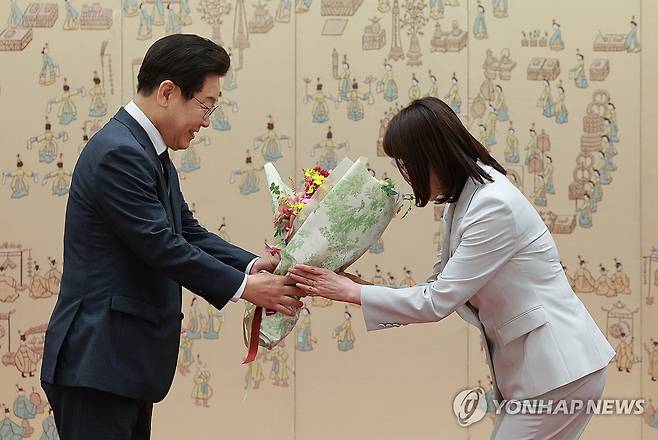 (서울=연합뉴스) 한상균 기자 = 이재명 대통령이 4일 서울 용산 대통령실에서 김민석 국무총리에게 임명장을 수여한 후 배우자인 이태린 여사에게 축하 꽃다발을 전달하고 있다. 2025.7.4 [대통령실통신사진기자단]