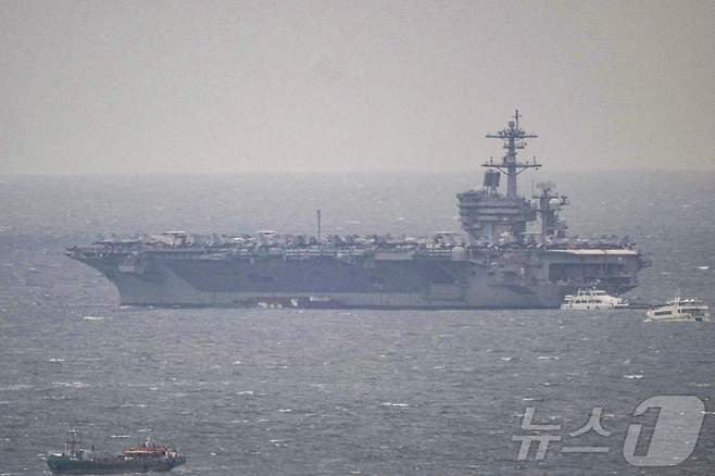 (마닐라 AFP=뉴스1) 김지완 기자 = 3일(현지시간) 미국의 핵추진 항공모함 조지워싱턴호가 필리핀 마닐라만에 도착한 모습. 2025.07.03