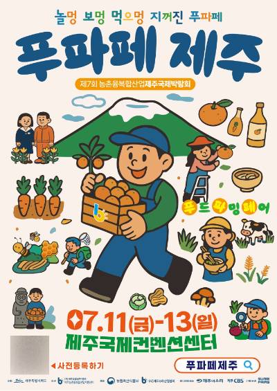 ◇박혜진> 제주의 농업과 기술을 연결하고 전통과 미래를 잇는 농촌융복합산업 박람회가 오는 11일부터 13일까지 제주국제컨벤션센터엥서 열립니다. '놀멍 보멍 먹으멍 지꺼진 푸파페'라는 부제로 열리는 이번 박람회에 100개 부스 규모의 전시와 체험 콘텐츠가 꾸며진다는데요.