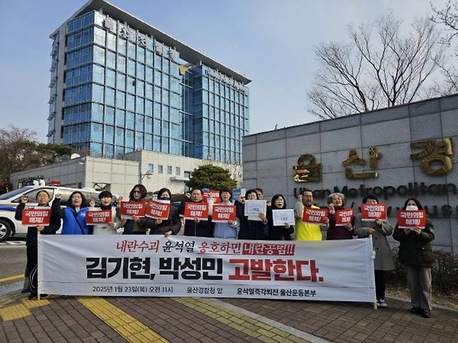 또 이들은 한 달 뒤인 1월 23일 김기현(울산 남구을), 박성민(울산 중구) 두 국민의힘 국회의원을 '내란수괴 윤석열을 옹호하는 내란 공범'으로 울산경찰청에 고발한 바 있다.