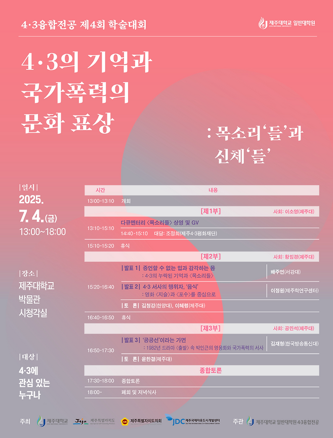 제주대학교 일반대학원 4.3융합전공은 4일 오후 제주대 박물관 시청각실에서 '4.3의 기억과 국가폭력의 문화 표상 : 목소리들과 신체들'을 주제로 한 제4회 학술대회를 개최했다.