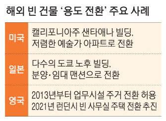 실제로 미국과 일본에선 이처럼 용도가 전환된 '컨버전 주택'이 곳곳에 생기고 있다. 미국 캘리포니아주에 있는 샌타애나 오피스 빌딩은 2021년 예술가를 위한 저렴한 주택·편의시설로 용도가 바뀌었다. 한국부동산개발협회에 따르면 일본 도쿄도 미나토구와 분쿄구에 각각 있던 오피스 빌딩들도 임대·분양 맨션으로 탈바꿈했다. 영국은 2013년부터 업무시설을 주거시설로 전환하는 것을 허용하고 있다.