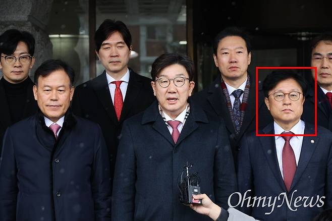 | ▲ 국민의힘 권성동 원내대표와 의원들이 12일 오전 내란 우두머리 혐의로 구속된 윤석열 대통령에 대한 탄핵심판 사건을 심리중인 헌법재판소를 항의방문한 뒤 입장을 밝히고 있다. 왼쪽부터 박충권, 윤한홍, 박성훈, 권성동, 박수민, 박형수(강조박스), 이종욱 의원. 2025.2.12 |
