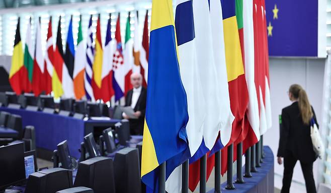 | ▲ 6월 18일(현지시간) 프랑스 스트라스부르 유럽의회 회의장에 유럽연합 회원국 국기들이 게양되어 있다. |