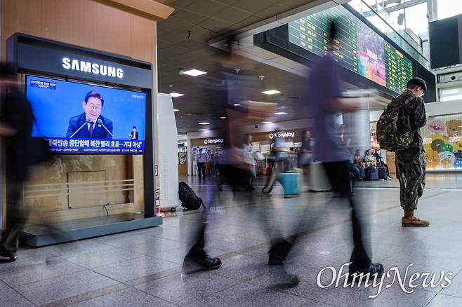 | ▲ 이재명 대통령 취임 30일 기자회견이 열린 3일 오전 서울역 대합실 TV화면에 기자회견이 생중계 되고 있다. |