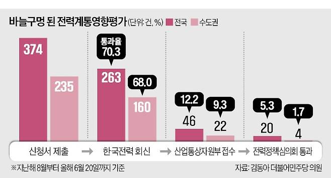 LG유플러스 평촌2센터는 연면적 4만450㎡인 초대형 IDC로 착공 때부터 각종 민원에 시달리며 우여곡절 끝에 준공됐다. LG유플러스가 2022년 서안양변전소에서 전기를 끌어 쓰기 위해 6.5㎞ 구간에 특고압선을 설치하려고 하자 지역 주민들은 “유해 전자파가 나올까 우려된다”며 반발했고 결국 이 구간에 전자파 차폐판을 설치해 갈등을 해소했다. 여기에 새로운 규제인 계통평가는 점점 ‘바늘구멍’이 돼가고 있다. 김동아 더불어민주당 의원이 한국전력공사와 산업부로부터 받은 자료에 따르면 지난해 8월부터 올해 6월 20일까지 한전에 계통평가를 신청한 전체 건수는 374건이다. 이 중 한전과 산업부를 거쳐 통과된 사례는 20건(5.3%)에 그쳤다. 수도권 기업이 신청한 계통평가 통과율은 1.7%(4건)에 불과했다. 수도권에서 준공 건물이 전기를 추가로 받는 데 성공한 사례는 1건뿐이었다.