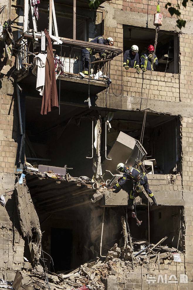 [키이우=AP/뉴시스] 4일(현지 시간) 우크라이나 키이우에서 구조대원들이 러시아의 공습으로 파손된 아파트 잔해를 정리하고 있다. 러시아가 3일 밤부터 4일 새벽 사이 전쟁 발발 이후 최대 규모의 드론과 미사일로 키이우를 공습해 23명이 부상한 것으로 알려졌다. 2025.07.04.