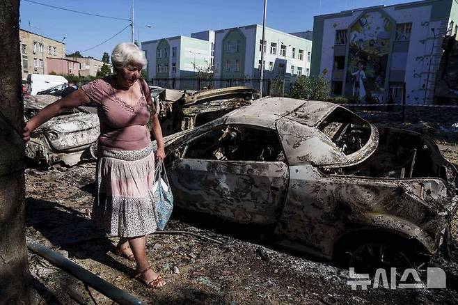 [키이우=AP/뉴시스] 4일(현지 시간) 우크라이나 키이우에서 한 주민이 러시아의 공습으로 파괴된 차량 주변을 지나고 있다. 러시아가 3일 밤부터 4일 새벽 사이 전쟁 발발 이후 최대 규모의 드론과 미사일로 키이우를 공습해 23명이 부상한 것으로 알려졌다. 2025.07.04.
