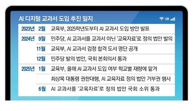 전면 의무 도입을 추진했던 교육부는 더불어민주당 반대로 원하는 학교만 자율적으로 사용하도록 했다. AI 교과서 도입에 작년에만 5300억원 넘는 예산이 투입됐다.