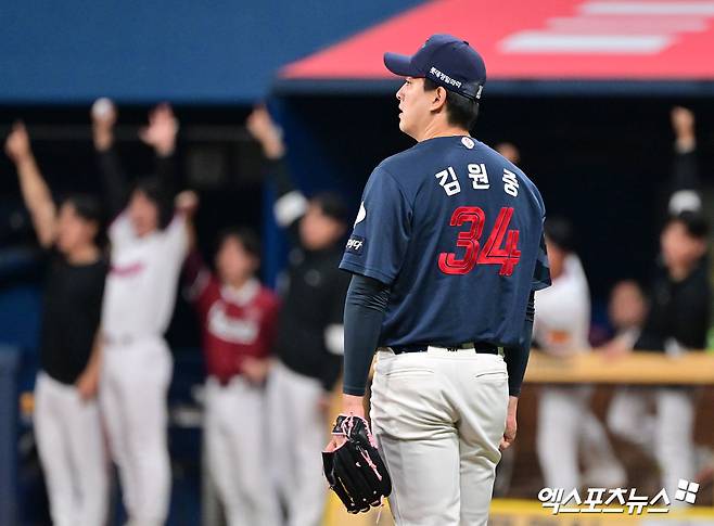 롯데는 9회 초 마운드에 곧장 마무리 투수 김원중을 투입했다. 김원중은 1사 뒤 박동원에게 볼넷을 내주면서 불안한 흐름을 보였다. 그 순간 김태형 감독이 마운드 위로 올라와 김원중과 짧게 얘길 나눈 뒤 내려갔다. 마운드에서 내려가는 김 감독이 갑작스럽게 미소를 짓는 게 중계 화면에 나와 눈길을 끌었다.