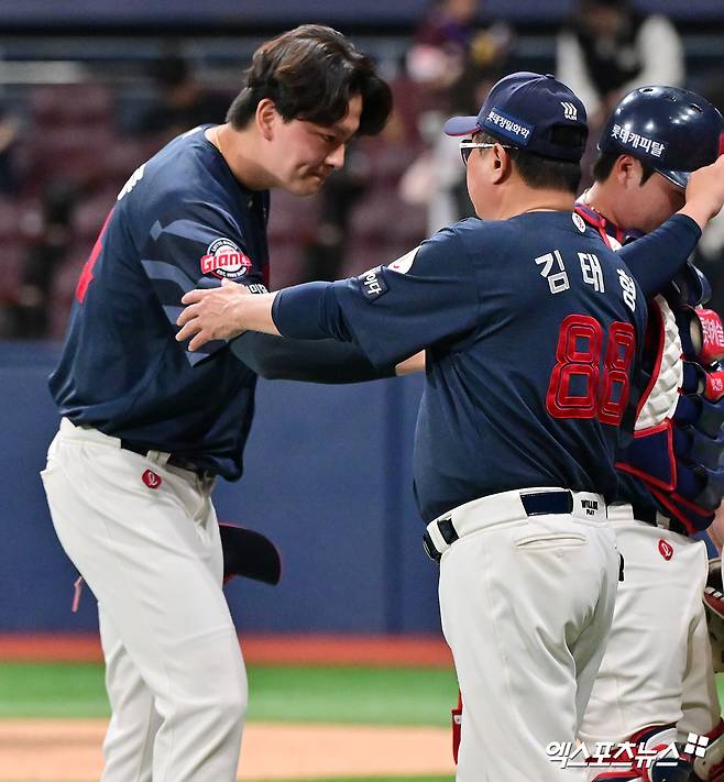 김태형 감독은 4일 광주 KIA 타이거즈전을 앞두고 취재진과 만나 "전날 9회 마운드에 올라갔다가 내려오는데 김원중이 갑자기 소리를 질러서 웃었다. 평상시 김원중다운 공이 안 나오더라. 맞든 안 맞든 공격적으로 들어가는 게 있어야 한다고 강조했다. 얘길 듣기 싫다는 건지 소리를 꽥 질러서(웃음)"라며 미소 지었다.
