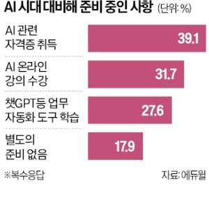 AI 전환 시대에 어떤 준비를 하고 있느냐는 질문(복수응답)에 ‘자격증 취득’(39.1%)이라는 답변이 1위를 차지했다. 이어 ‘AI·빅데이터 등 관련 온라인 강의 수강’(31.7%), ‘챗GPT·노션AI 등 업무 자동화 도구 학습’(27.6%) 등 순이었다. ‘별도로 준비하지 않는다’는 응답은 17.9%에 그쳤다.
