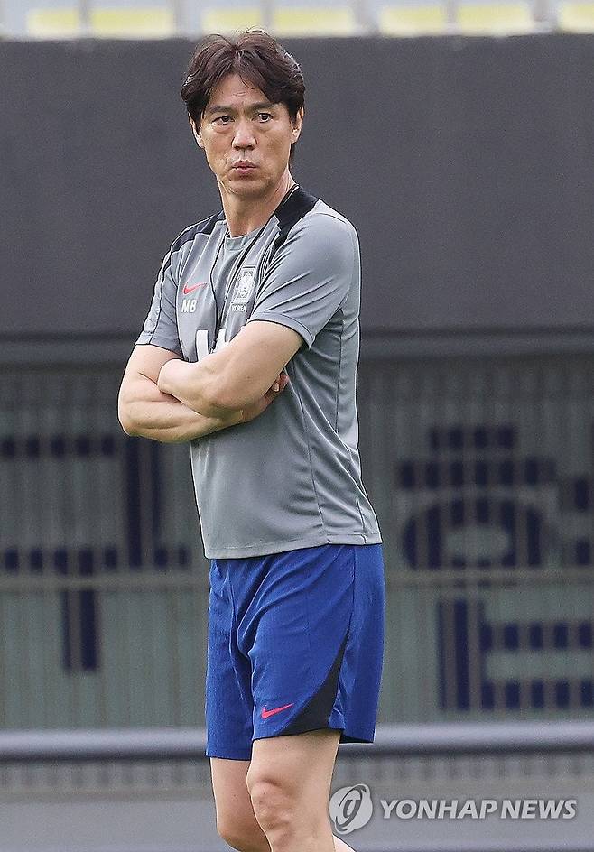 (성남=연합뉴스) 홍기원 기자 = 2025년 동아시아축구연맹(EAFF) E-1 챔피언십(동아시안컵)을 앞둔 축구 국가대표팀 홍명보 감독이 4일 경기도 성남시 중원구 성남종합운동장에서 훈련하는 선수들을 지켜보고 있다. 2025.7.4