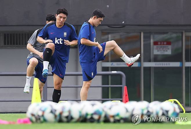 (성남=연합뉴스) 홍기원 기자 = 2025년 동아시아축구연맹(EAFF) E-1 챔피언십(동아시안컵)을 앞둔 축구 국가대표팀 선수들이 4일 경기도 성남시 중원구 성남종합운동장에서 훈련하고 있다. 2025.7.4
