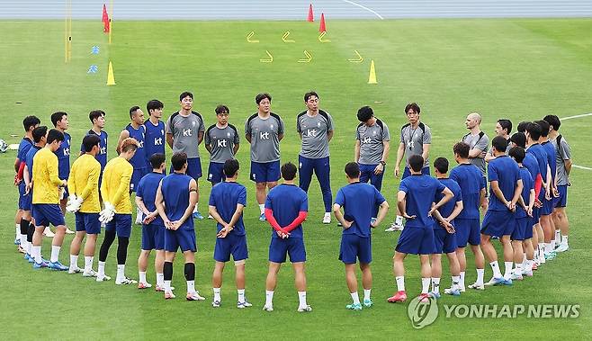 (성남=연합뉴스) 홍기원 기자 = 2025년 동아시아축구연맹(EAFF) E-1 챔피언십(동아시안컵)을 앞둔 축구 국가대표팀 홍명보 감독이 4일 경기도 성남시 중원구 성남종합운동장에서 훈련 시작에 앞서 선수들에게 이야기하고 있다. 2025.7.4