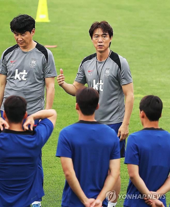 (성남=연합뉴스) 홍기원 기자 = 2025년 동아시아축구연맹(EAFF) E-1 챔피언십(동아시안컵)을 앞둔 축구 국가대표팀 홍명보 감독이 4일 경기도 성남시 중원구 성남종합운동장에서 훈련 시작에 앞서 선수들에게 이야기하고 있다. 2025.7.4