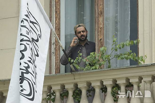 [모스크바=AP/뉴시스]러시아가 4일 세계 최초로 아프가니스탄 탈레반 정부를 공식 인정한 후 모스크바 주재 아프가니스탄 대사관 발코니에서 한 남성이 전화 통화를 하고 있다. 2025.07.04.