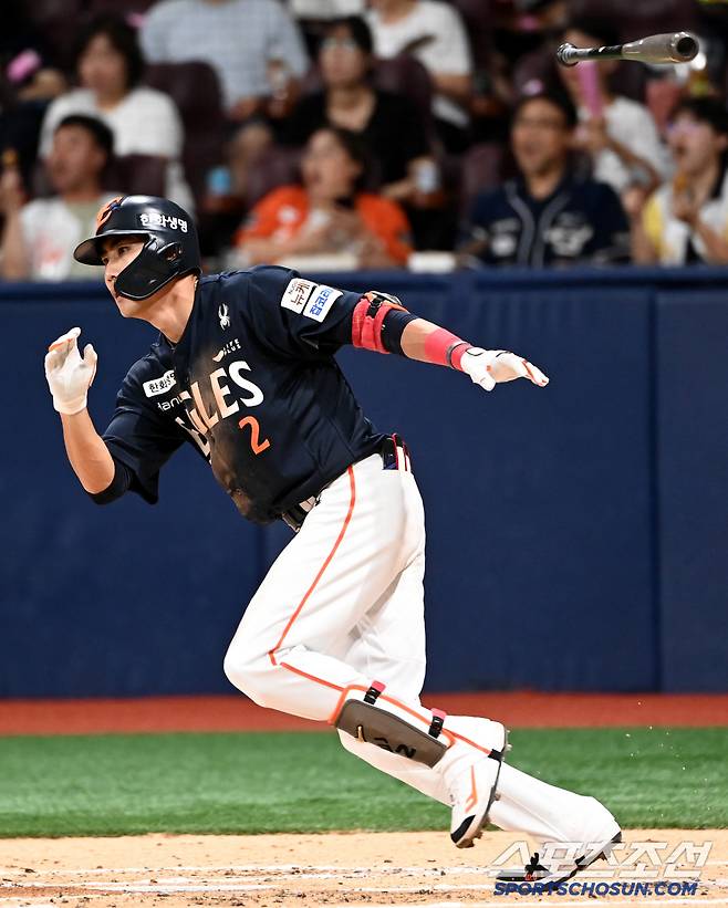 4일 고척스카이돔에서 열린 한화와 키움의 경기, 3회초 1사 1루 심우준이 2루타를 치고 있다. 고척=허상욱 기자wook@sportschosun.com/2025.07.04/