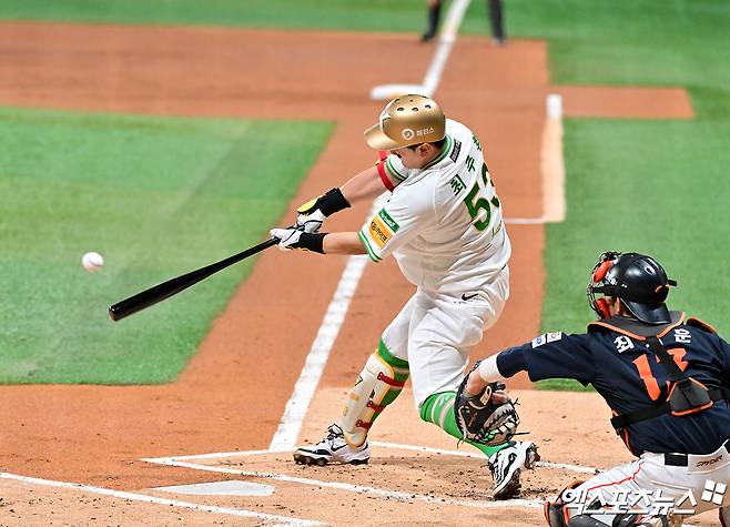 (엑스포츠뉴스 고척, 김한준 기자) 4일 오후 서울 구로구 고척스카이돔에서 열린 '2025 신한 SOL Bank KBO리그' 한화 이글스와 키움 히어로즈의 경기, 1회말 2사 2루 키움 최주환이 1타점 2루타를 날리고 있다.