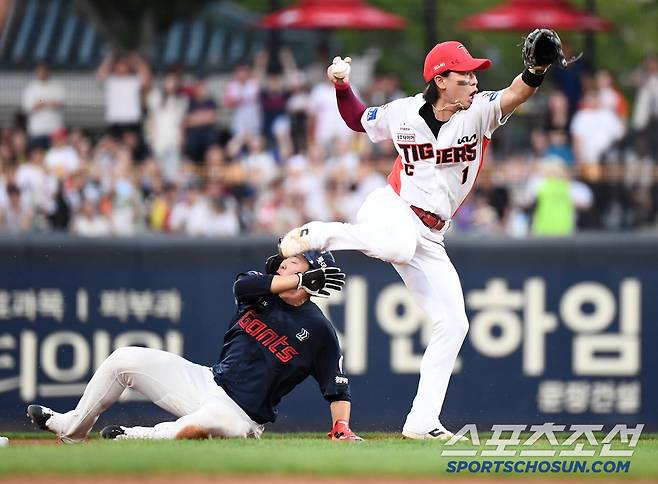 4일 광주 기아 챔피언스필드에서 열린 롯데-KIA전. 4회초 무사 1루 레이예스의 유격수 병살타 때 박찬호가 1루 송구 동작에서 박찬형과 충돌하고 있다. 광주=정재근 기자 cjg@sportschosun.com/2025.7.4/