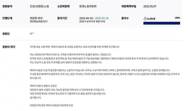 자신을 한 가정의 가장이자 택배기사라고 소개한 청원인 A 씨는 "최근 CJ대한통운과 한진택배 등 주요 택배사들이 주 7일 배송제를 시행하면서, 택배기사들의 과로와 휴식 부족 문제가 심각해지고 있다"면서 "이는 단순히 노동 강도의 문제를 넘어 생명과 건강권을 위협하는 상황이다"라고 지적했다.