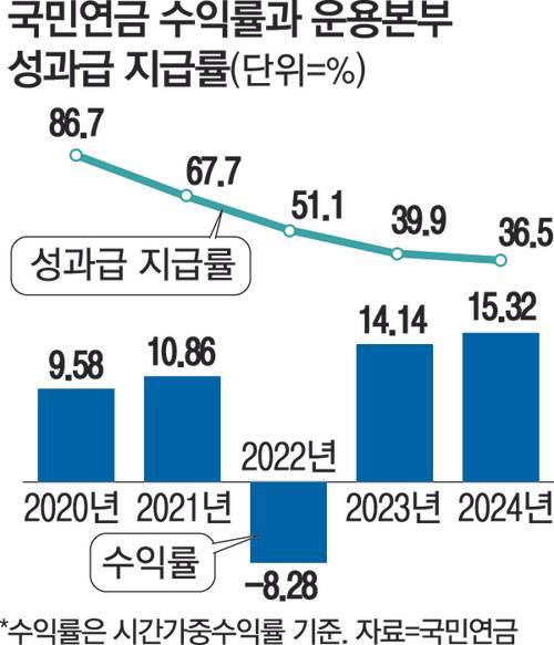 지난해 국민연금이 역대 최고 수익률을 기록했으나 기준 수익률을 하회해 오히려 성과급은 전년 대비 줄었다.