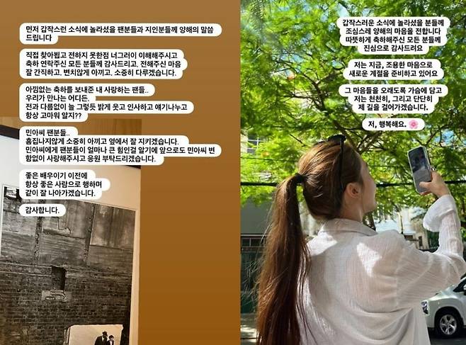 같은 날 민아도 자신의 SNS를 통해 소감을 전했다. 민아는 "갑작스러운 소식에 놀라셨을 분들께 조심스레 양해의 마음을 전한다"라며 "따뜻하게 축하해주신 모든 분들께 진심으로 감사드린다. 저는 지금 조용한 마음으로 새로운 계절을 준비하고 있다"라고 밝혔다.