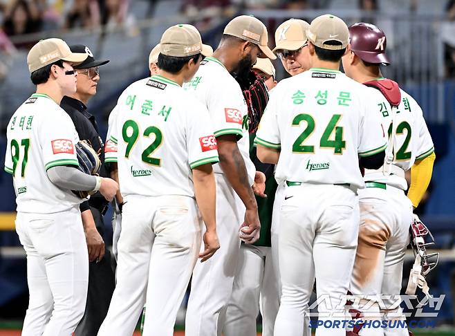 4일 고척스카이돔에서 열린 한화와 키움의 경기, 8회초 키움 홍원기 감독이 마운드에 올라와 호투한 알칸타라를 교체하고 있다. 고척=허상욱 기자wook@sportschosun.com/2025.07.04/