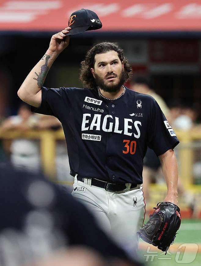 (서울=뉴스1) 김진환 기자 = 4일 오후 서울 구로구 고척스카이돔에서 열린 프로야구 '2025 신한 SOL뱅크 KBO 리그' 한화 이글스와 키움 히어로즈의 경기, 한화 선발 폰세가 7회말 2사 키움 김건희를 삼진으로 잡은 뒤 팬들 연호에 모자를 벗어 답례하고 있다. 2025.7.4/뉴스1