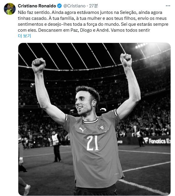 "당신의 가족과 아내, 그리고 아이들에게 깊은 애도를 표한다. 세상의 모든 힘이 당신과 당신 주변에 가닿길 기원한다"며 "조타, 당신은 영원히 함께할 것이다. 편히 쉬세요. 디오고 그리고 앙드레. 우린 모두 당신을 그리워할 것"이라고 덧붙였다.